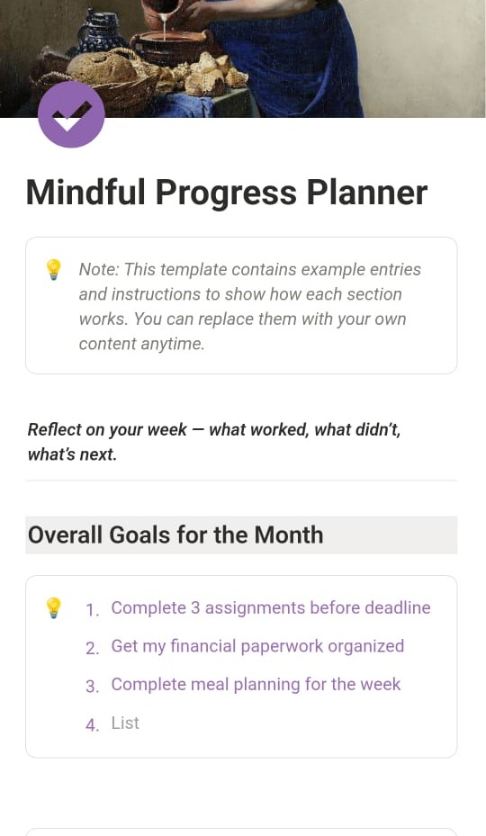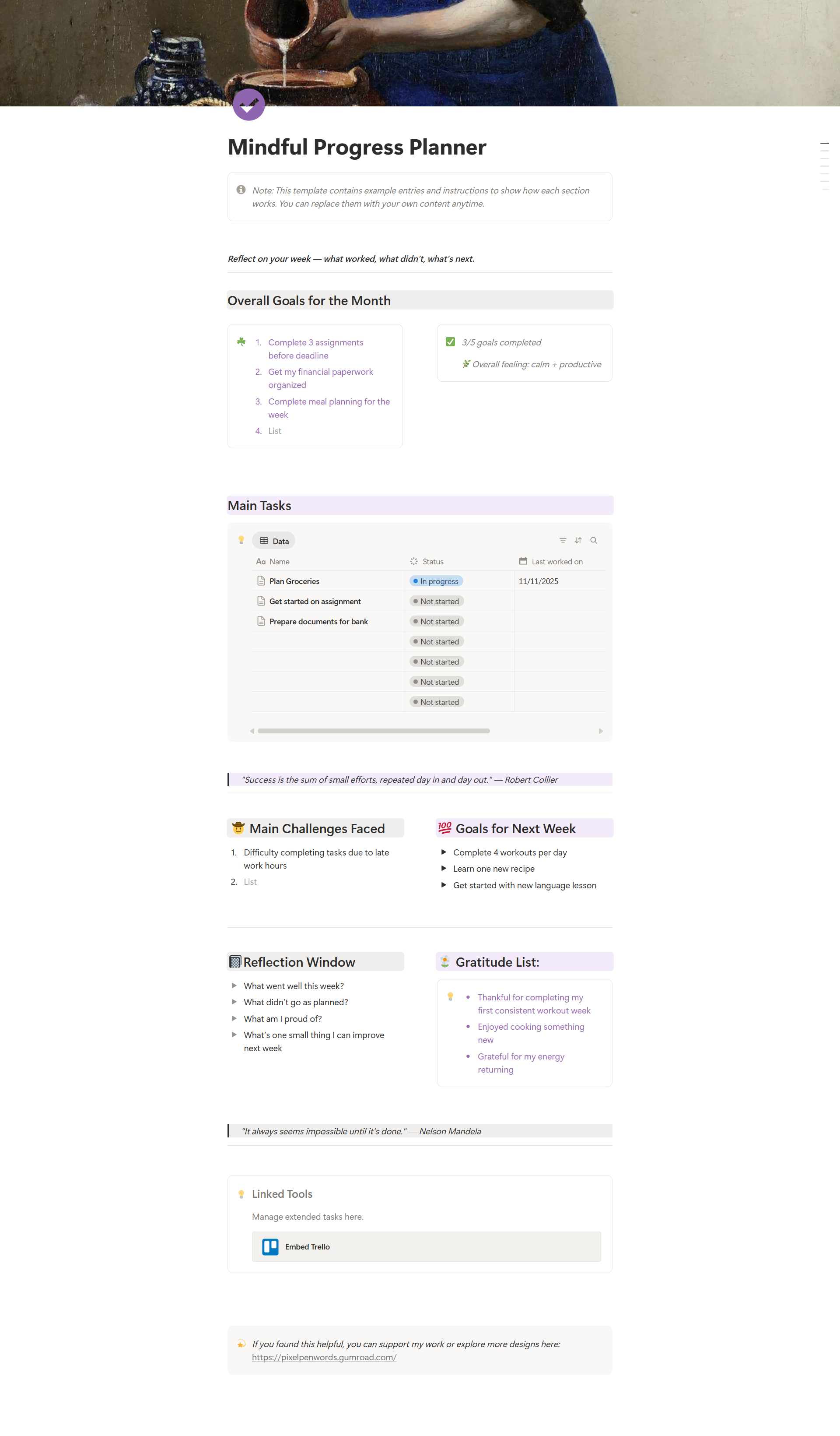 Mindful Progress Planner is a clean and structured Notion template designed to help you plan intentionally and reflect peacefully. Whether you’re tracking weekly goals, noting challenges, or recording small wins, this planner keeps everything in one calm space; no clutter, no overwhelm.